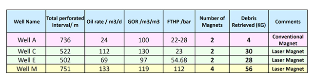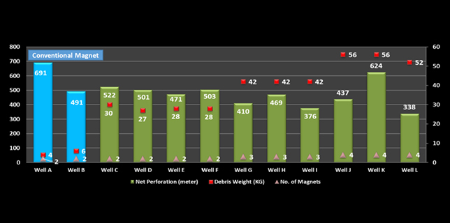 The benefits extended to vertical wells as well. In Well FE, a single magnet retrieved 5 kg of debris from a shorter perforation, while another vertical test achieved 7 kg, underscoring the technology’s adaptability across completion types.