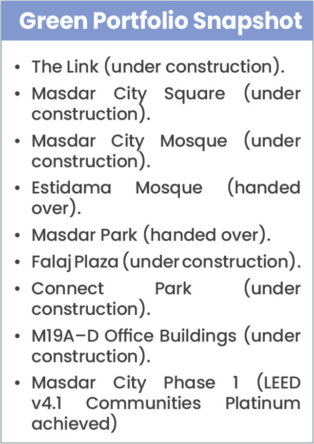 The Green Portfolio illustrates these ambitions in action. It includes projects that define a new urban standard, such as The Link, Masdar City Square, Masdar City Mosque, Estidama Mosque, Masdar Park, Falaj Plaza, Connect Park, and M19A–D office buildings.