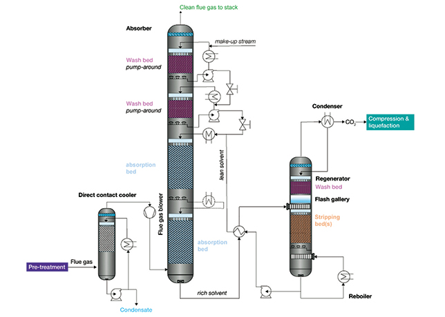 A carbon capture plant consists of three main columns: the direct contact cooler (DCC), the CO2 absorber, and the CO2 stripper (Figure 1); and Sulzer offers unique solutions for all three sections of the process.