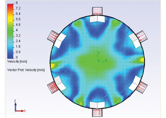 Figure 10 ... CFD results showin flow pattern right above reboiler-return nozzles with column diameter of 10 m |