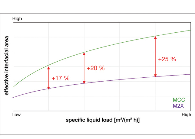 A higher effective interfacial area yields higher absorption efficiency. Figure 3 (pilot tests for CO2 absorption from air into NaOH) shows that Sulzer MellapakCC™ provides 17-25 per cent more effective interfacial area than Mellapak™ 2X.