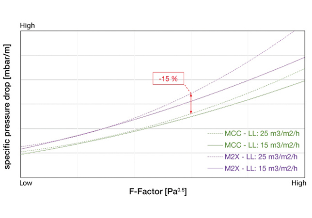 Figure 4 ... specific pressure drop of MCC and M2X versus F-Factor at 15 and 25 cu m (sq m h) |