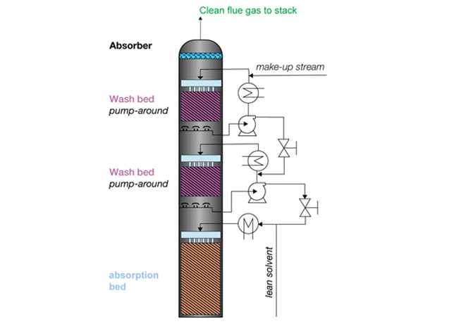 • CO2 absorption: As shown in Figure 1, the CO2 absorption section typically features two to three packed beds, depending on the capture target, process configuration, and solvent properties.