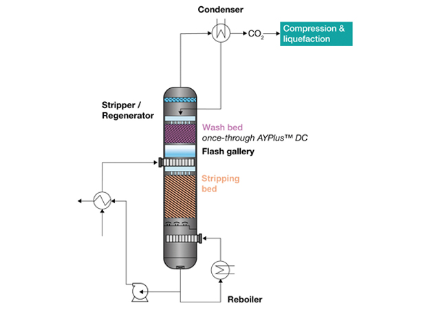 The condensed water from the overhead CO2 cooler is routed to the wash bed, fully exploiting the superior wetting and transfer characteristics of AYPlus™ DC at minimum liquid loads.