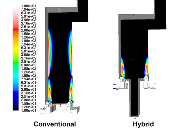 The hybrid design changes the radiant box geometry compared to a conventional heater, which affects airflow and reduces the space available for combustion.