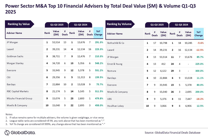 GlobalData has announced the latest Financial and Legal Adviser League Tables, which rank advisers by the total value and volume of merger and acquisition (M&A) deals they advised on in the power sector during Q1-Q3 2025.