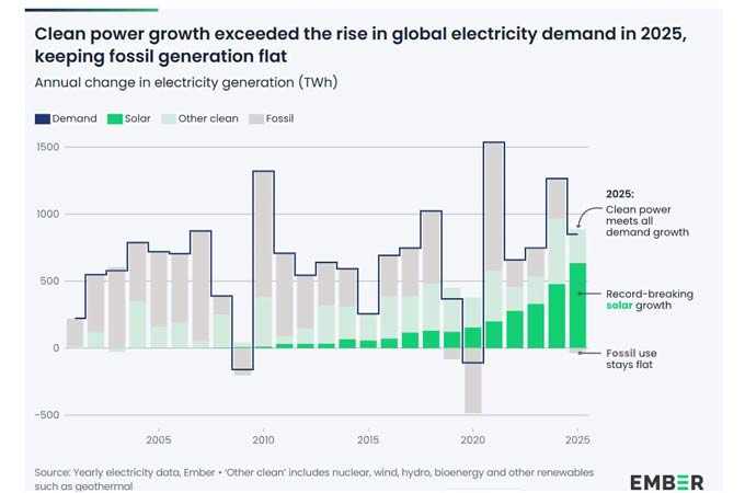 Record solar energy growth meant clean power sources grew fast enough to meet all new electricity demand in 2025, thereby preventing an increase in fossil generation.